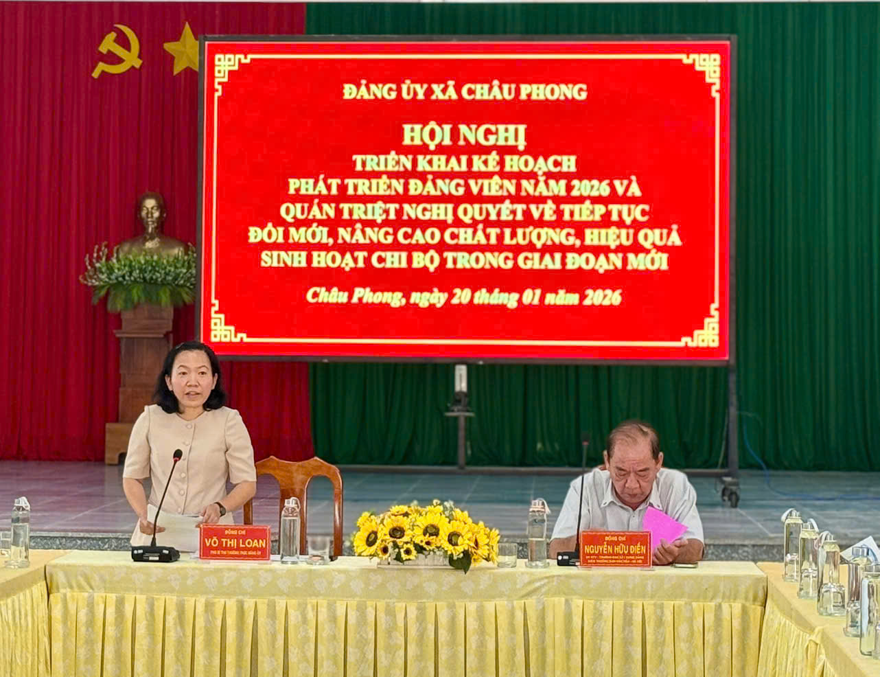 Chiều ngày 20/01/2026, Đảng ủy xã Châu Phong tổ chức Hội nghị triển khai Kế hoạch phát triển đảng viên và Kế hoạch thực hiện Chỉ thị số 50-CT/TW của Ban Bí thư về tiếp tục đổi mới, nâng cao chất lượng sinh hoạt Chi bộ trong giai đoạn mới. Đồng chí Võ Thị Loan – Phó Bí thư Thường trực Đảng ủy xã chủ trì hội nghị.