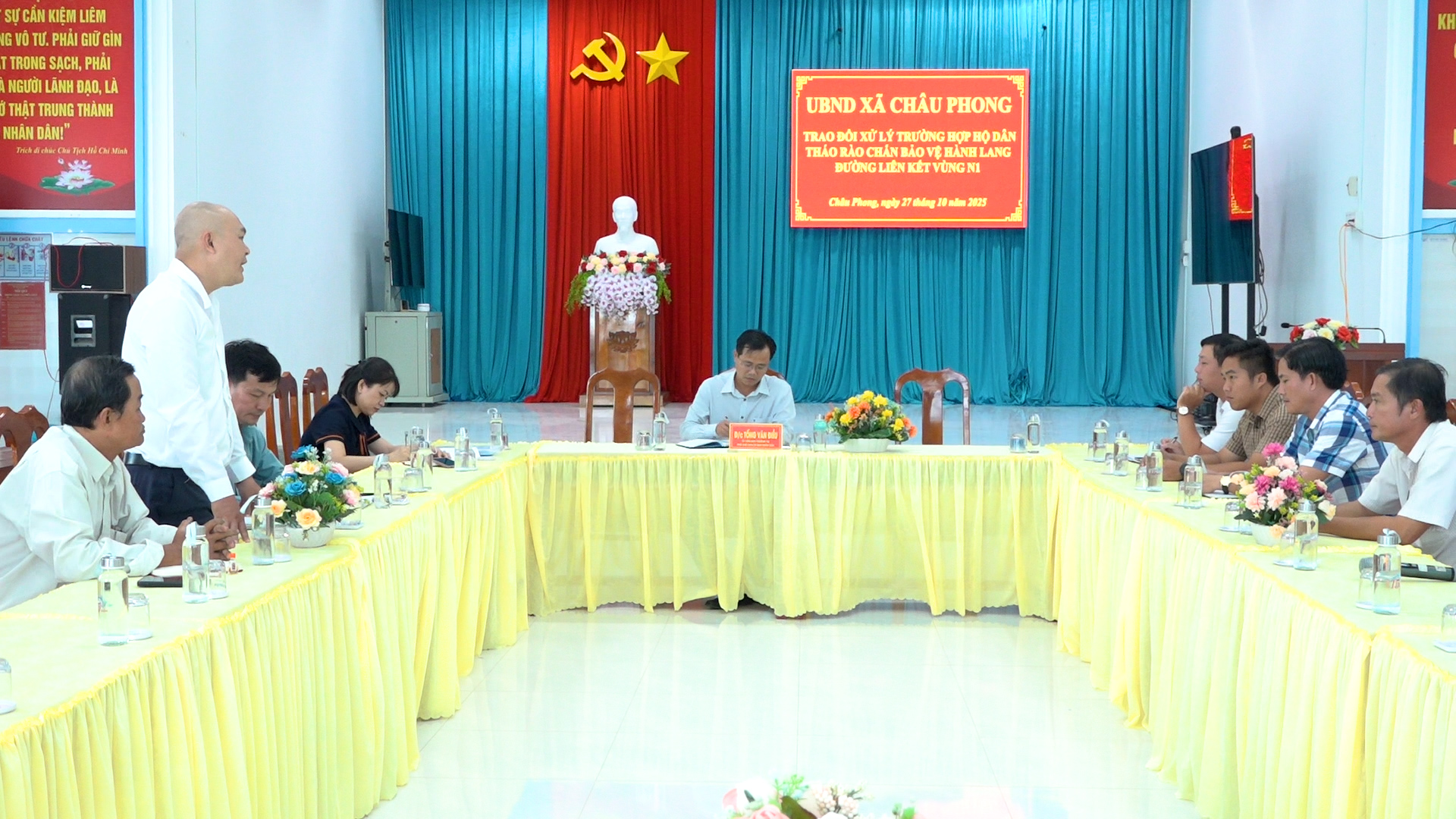 Chiều ngày 27/10/2025, UBND xã Châu Phong họp trao đổi xử lý trường hợp hộ dân tháo rào chắn bảo vệ hành lang đường liên kết vùng N1. Cuộc họp do Phó Chủ tịch UBND xã Tống Văn Điều chủ trì.